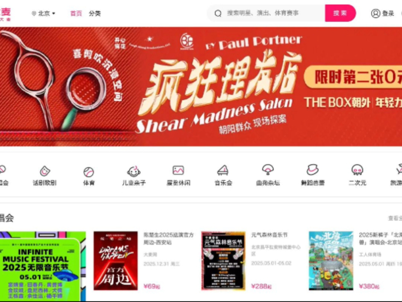 大麦(ダーマイ/Damai)は、アリババグループが運営する中国最大の公式チケット販売プラットフォームです。メジャーアーティストのツアーから地域の演劇まで幅広く取り扱っており、すべてのチケットが正規ルートで販売されています。公式販売のため偽造チケットのリスクが低く、中国国内で最も信頼されているサービスの一つです。