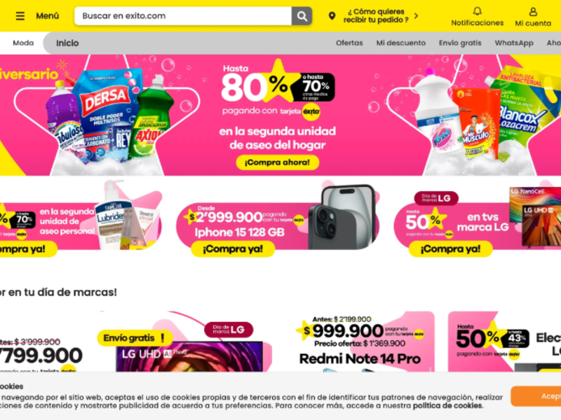 Almacenes Éxitoは、コロンビアを代表する大手小売グループ「Grupo Éxito」が運営するスーパーマーケットチェーンです。食料品から衣料品、家電、日用品まで幅広い商品を取り扱い、コロンビアの人々の生活に深く根ざしています。オンラインストアも充実しており、コロンビア国内では非常に人気のあるショッピングサイトです。